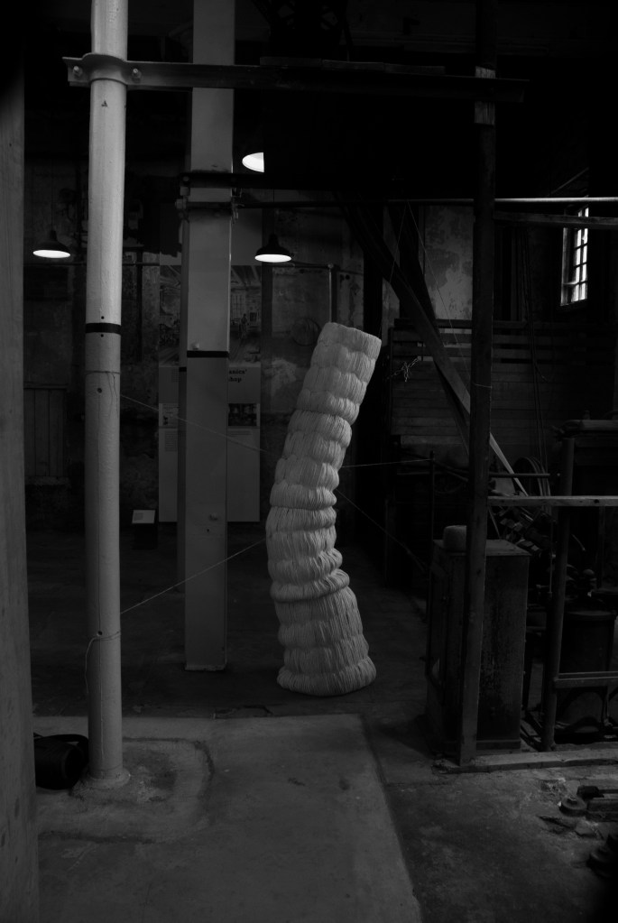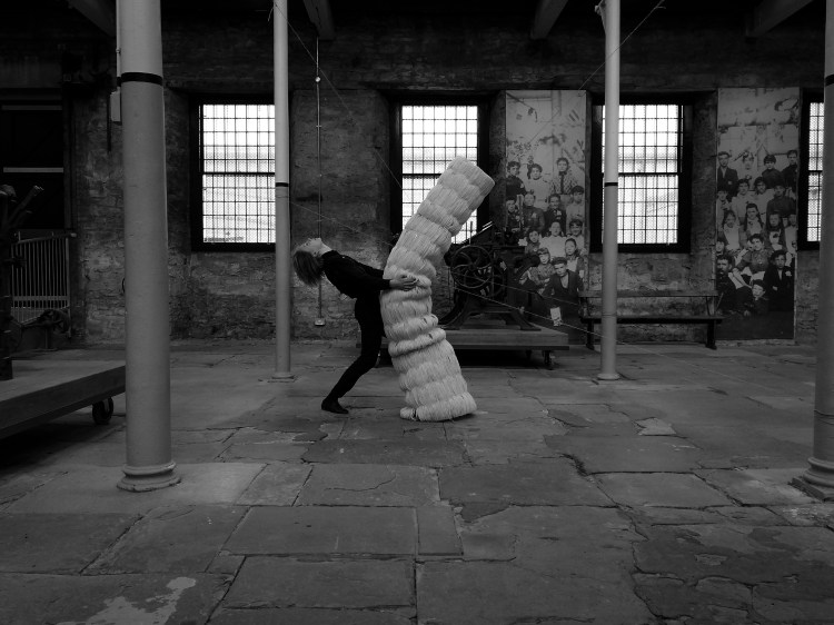 Photo documentation of performance with sculpture carried out at Verdant Works, Dundee, Scotland, April 2019